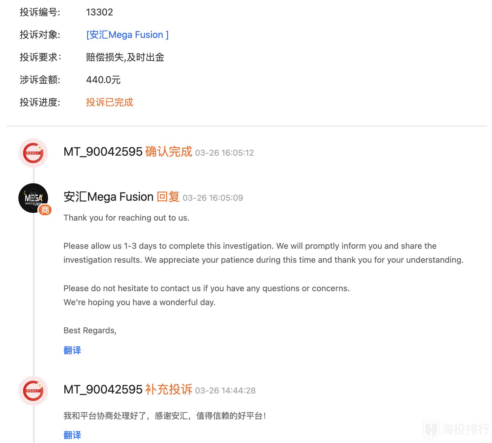 用户最新反馈:已与Mega Fusion(安汇)协商解决!问题处理完成,表示“感谢平台”!