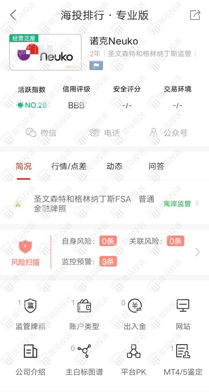 这家平台叫Neuko诺克,成立于2021年,全球排名28名,目前有1个圣文森特和格林纳丁斯FSA的监管,牌照类型为普通金融牌照,业务权限支持CFDs,风险扫描显示3条风险,投资者资金安全有保障。