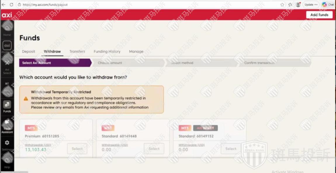 近日,来自于海外用户向斑马投诉反映,在“AxiTrader”平台出金延迟问题。