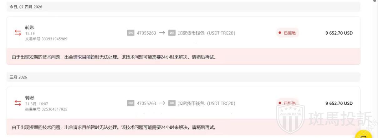 A某称,自2026年3月27日以来,本人选择USDT TRC20通道出金,均被平台直接标记“已拒绝”。