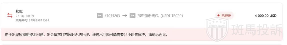拒绝理由统一为:“由于出现短期的技术问题,出金请求目前暂时无法处理。该技术问题可能需要24小时来解决。请稍后再试。”