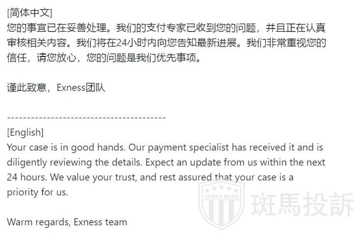 A某表示,自己全程按照Exness平台要求,完整提交身份证、银行卡、资金来源证明等所有合规认证资料,全程配合平台KYC审核。而平台却以“您的事宜已在妥善处理。我们的支付专家已收到您的问题,并且正在认真审核相关内容。我们将在24小时内向您告知最新进展。我们非常重视您的信任,请您放心,您的问题是我们优先事项。”为由一直都是24小时拖延不处理。