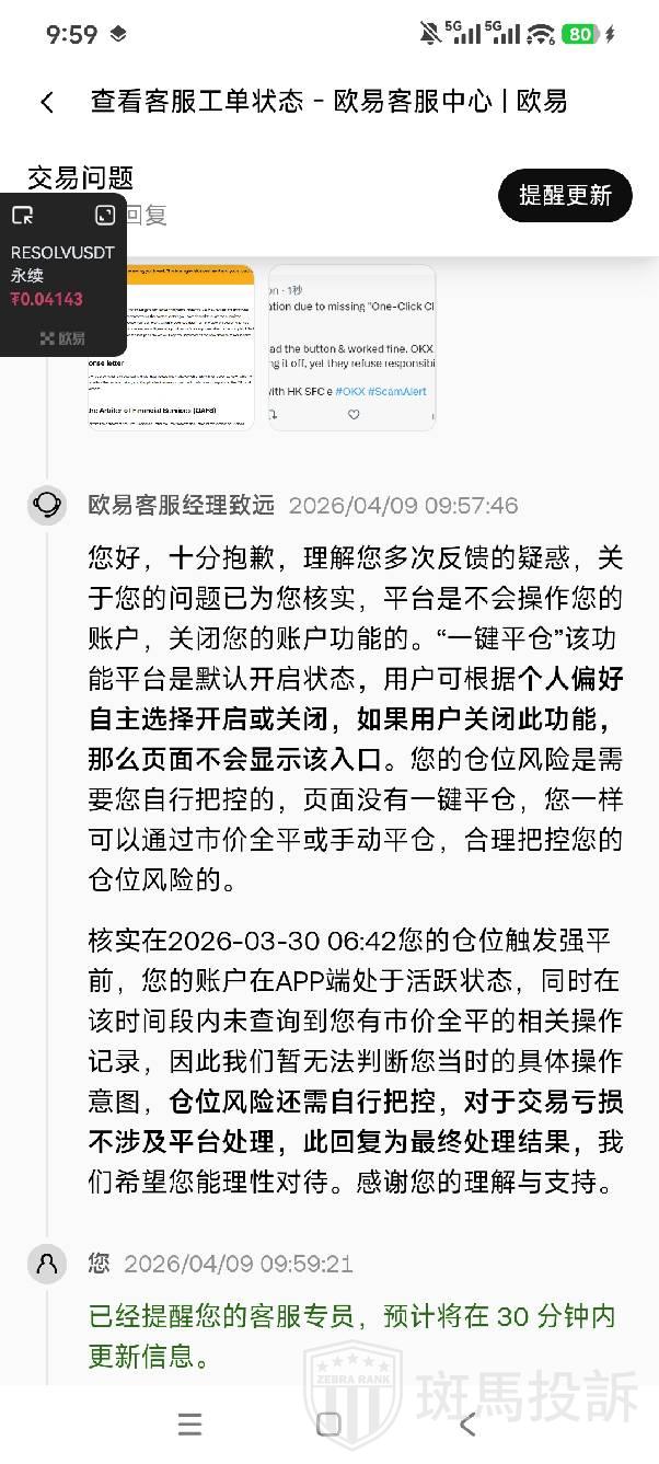 该用户与OKX客服沟通后,得到的回应如下:您好,十分抱歉,理解您多次反馈的疑惑,关于您的问题已为您核实,平台是不会操作您的账户,关闭您的账户功能的。“一键平仓”该功能平台是默认开启状态,用户可根据个人偏好自主选择开启或关闭,如果用户关闭此功能,那么页面不会显示该入口。您的仓位风险是需要您自行把控的,页面没有一键平仓,您一样可以通过市价全平或手动平仓,合理把控您的仓位风险的。