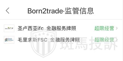Born2trade外汇平台受圣卢西亚ifc和授权并监管,监管证号为 2025-00375,以及毛里求斯FSC授权并监管,市场有风险,投资者需谨慎选择。