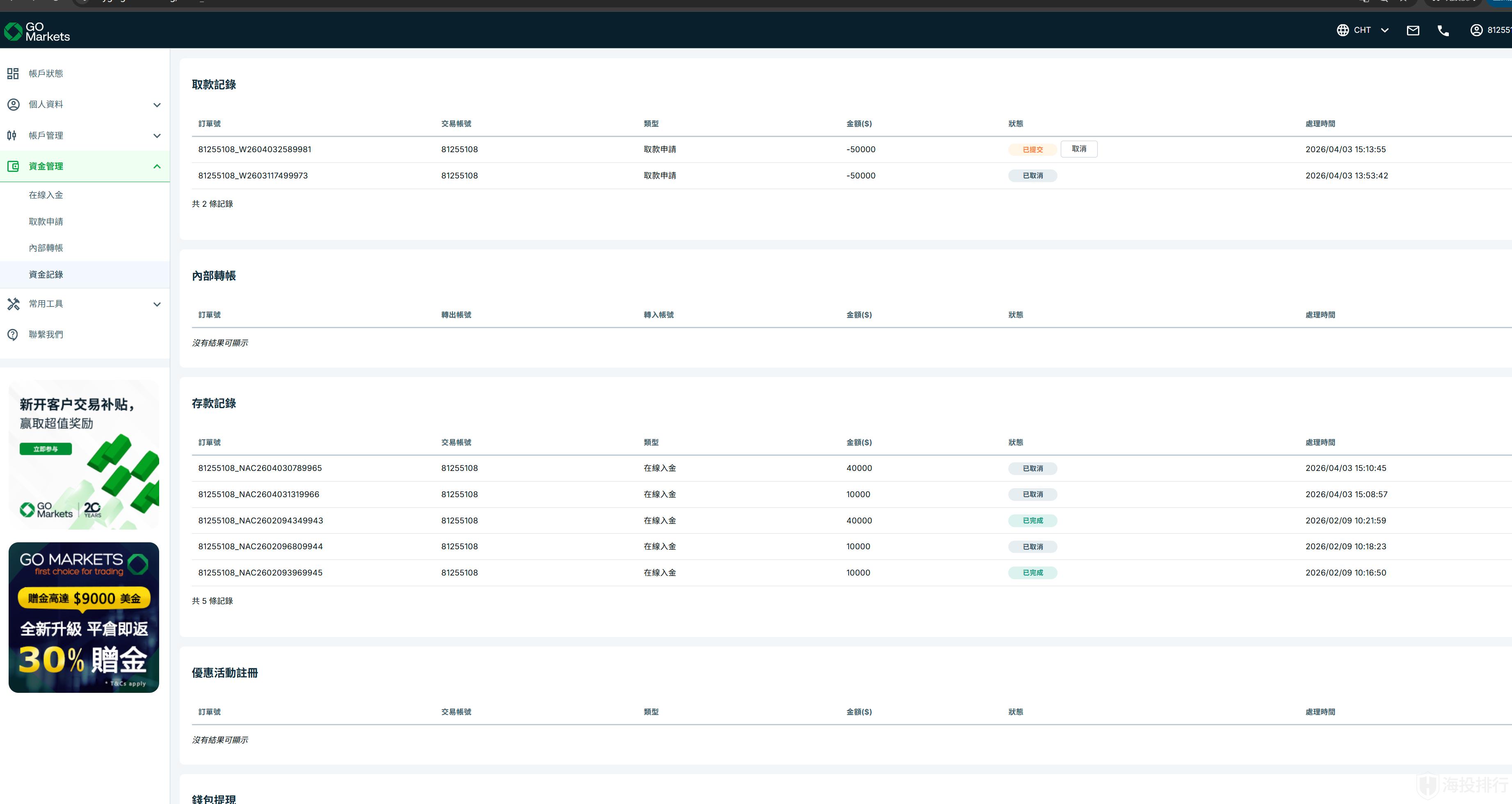 用户在高汇GO Markets的经历如下:2月初入金50000美元,因时局动荡未进行交易,它决定出金暂时观望。