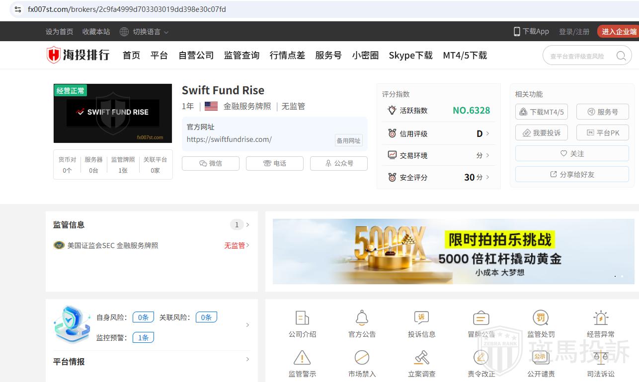 这家平台叫Swift Fund Rise,成立于2025年,全球活跃指数6328名,目前有1个监管,没有外汇牌照,不能做外汇保证金交易,风险扫描显示3条风险,投资者资金安全无保障。