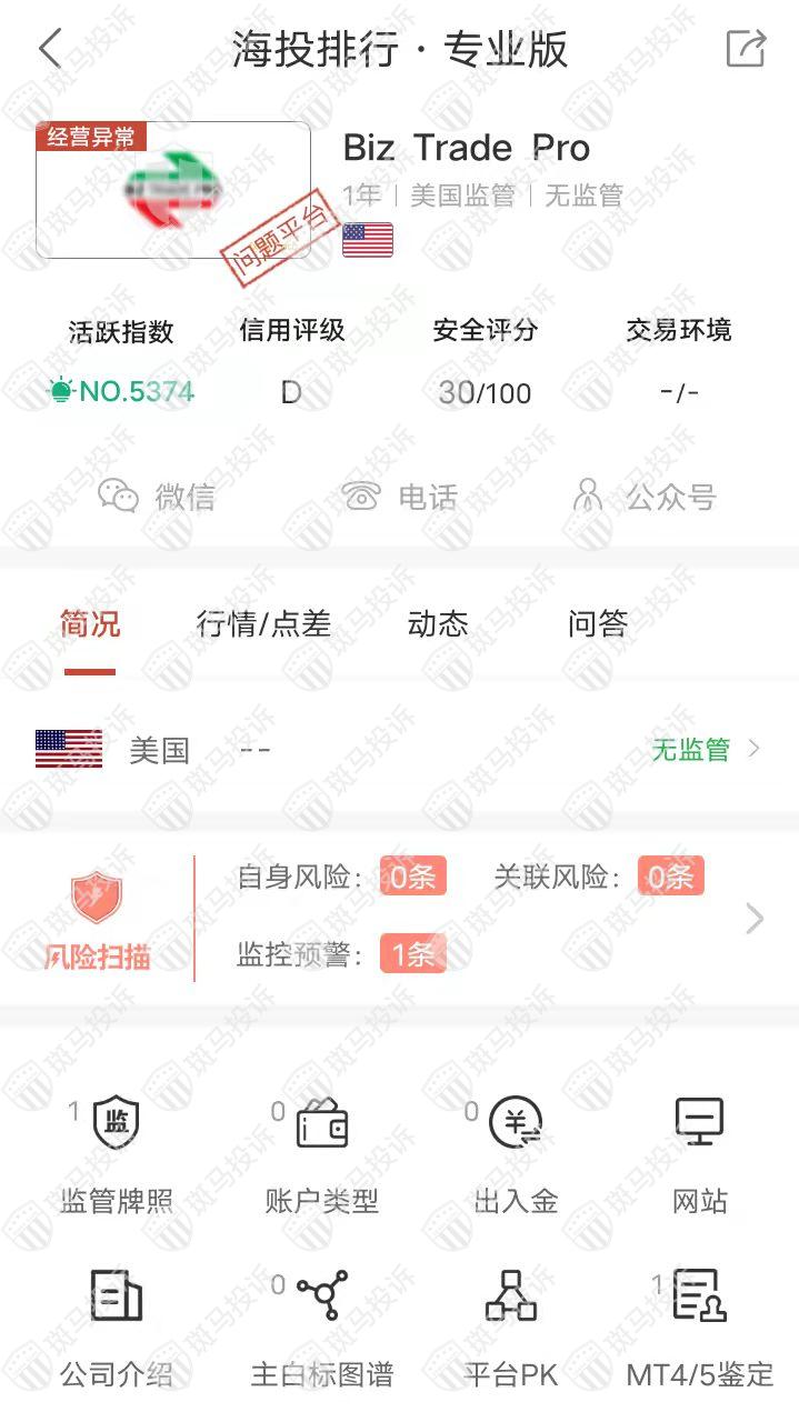 这家平台叫Biz Trade Pro,成立于2022年,全球活跃指数5374名,目前无监管,没有外汇牌照,不能做外汇保证金交易,风险扫描显示1条风险,投资者资金安全无保障。