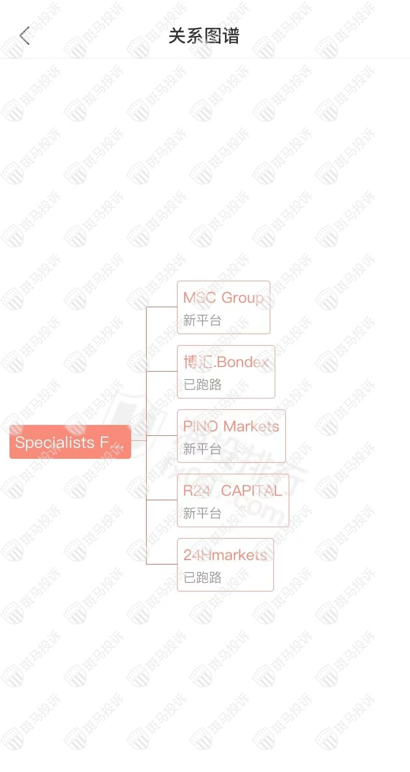 主白标关系显示Specialists Forex平台和5家平台是一家公司,从他们的服务器地址,网站的模板来看,都可以看出来相似的地方。其中博汇.Bondex、24Hmarkets已跑路。
