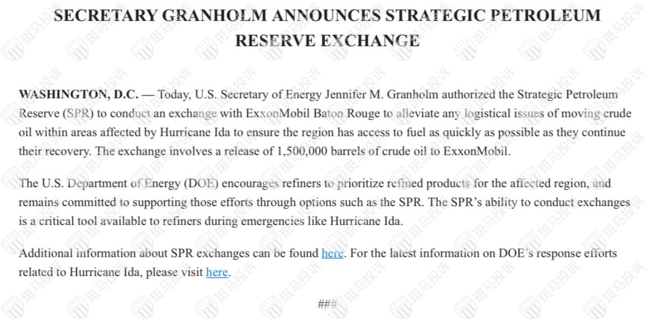 美国能源部也于周四确认,将向埃克森美孚旗下的路易斯安那炼厂出借150万桶原油,该炼厂的产能为51.7万桶/天。