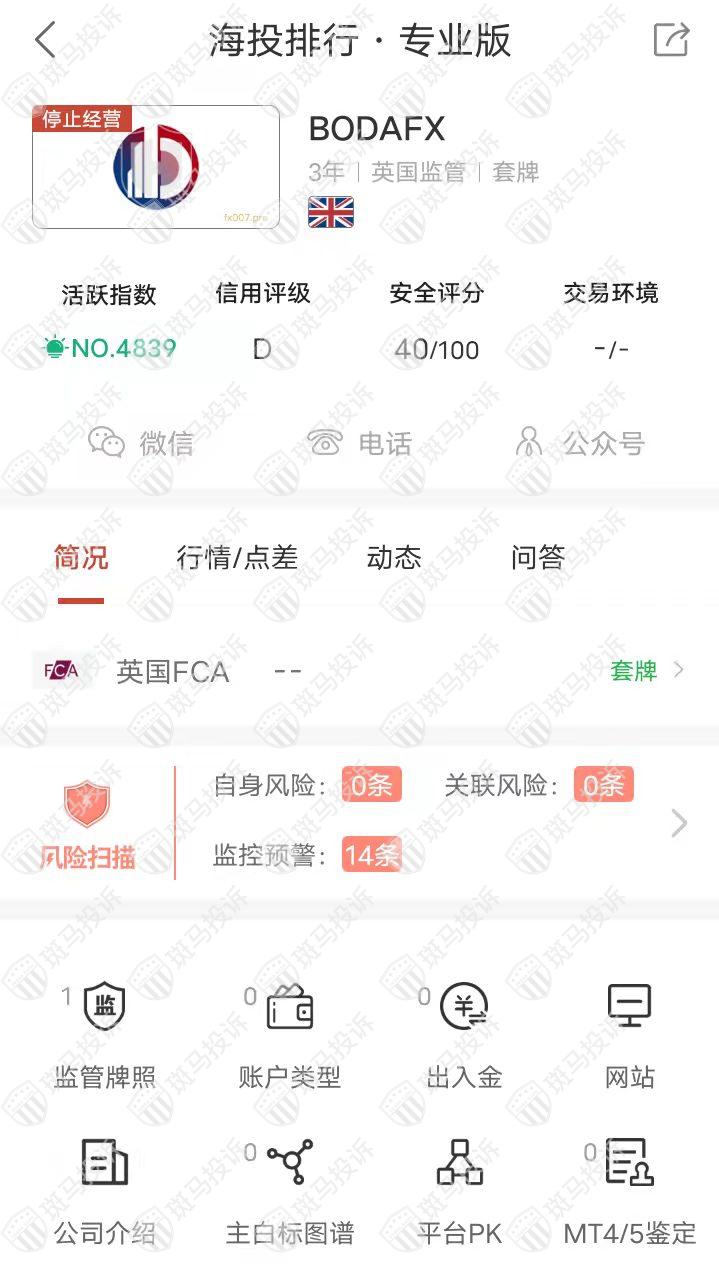 这家平台叫BODAFX,成立于2019年,全球活跃指数4839名,目前无监管,但是有存在套牌行为,没有外汇牌照,不能做外汇保证金交易,风险扫描显示14条风险,投资者资金安全无保障。