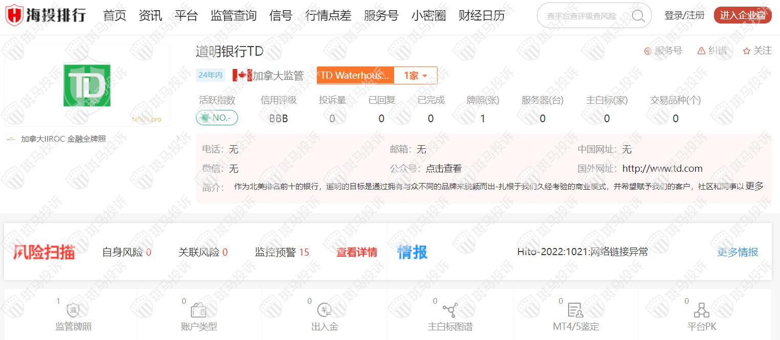 TD道明银行平台成立于1998年,风险扫描显示15条风险,投资者需注意其风险提示信息。