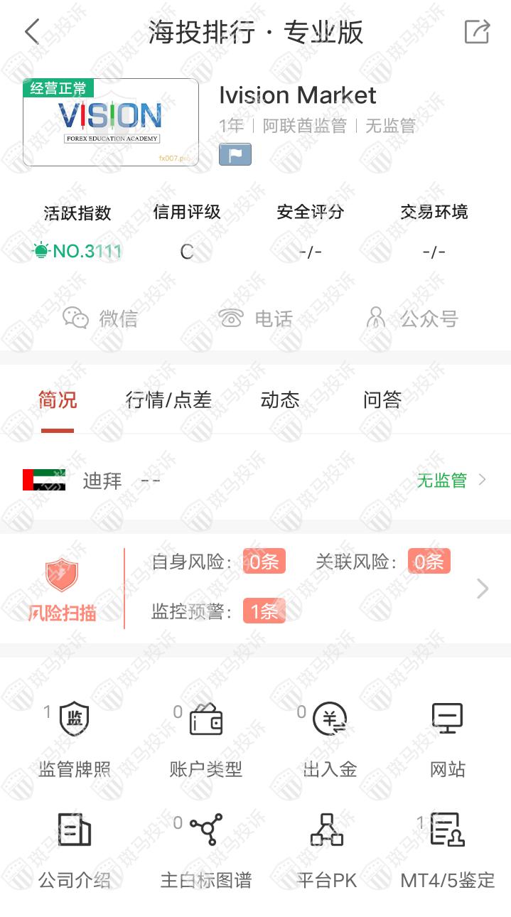 这家平台叫Ivision Market,成立于2021年,全球排名3111名,目前无监管,没有外汇牌照,不能做外汇保证金交易,风险扫描显示1条风险,投资者资金安全无保障。