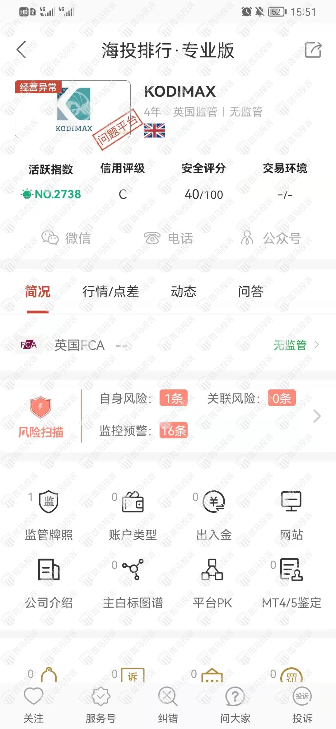 这家平台叫KODIMAX,成立于2018年,全球活跃指数2738名,目前无监管,没有外汇牌照,不能做外汇保证金交易,风险扫描显示15条风险,投资者资金安全无保障。