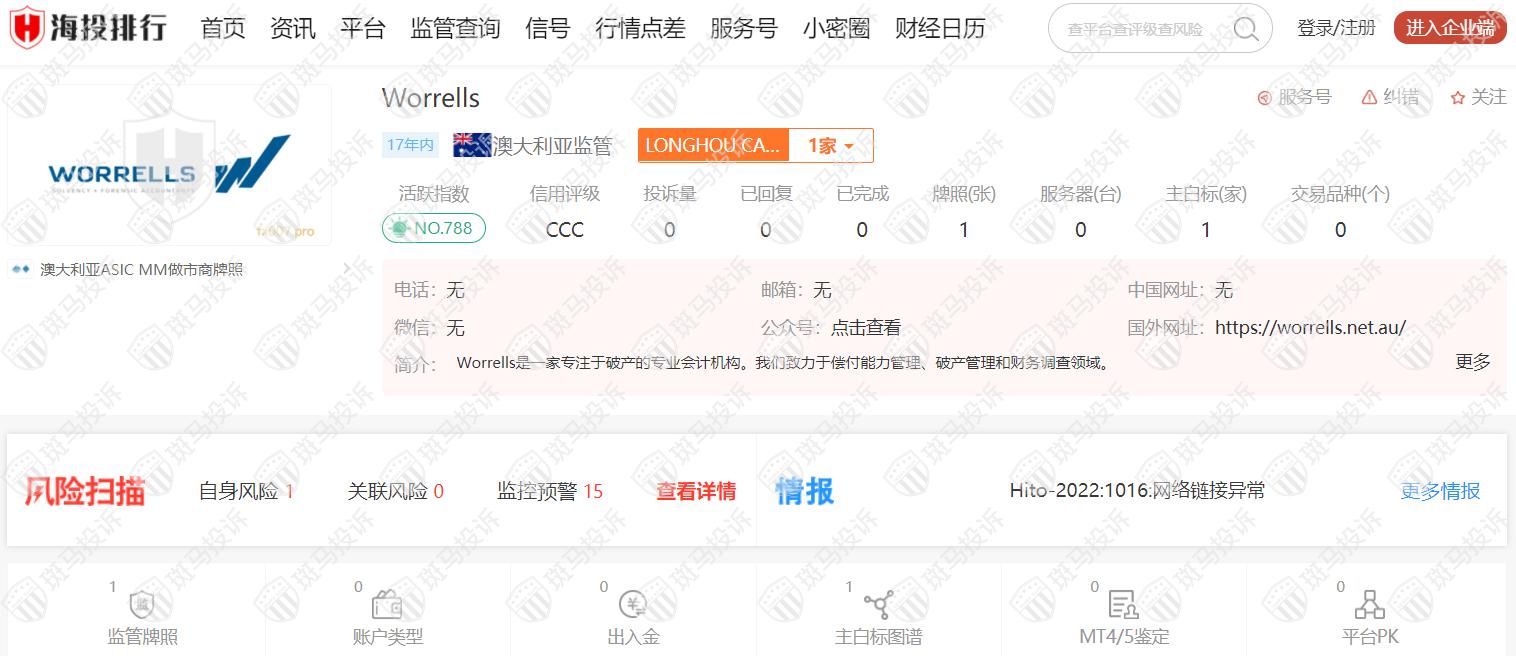 Worrells平台成立于2005年,由澳大利亚ASIC监管,监管号码292464,但监管已失效,风险扫描显示15条风险,投资者需注意其风险提示信息。