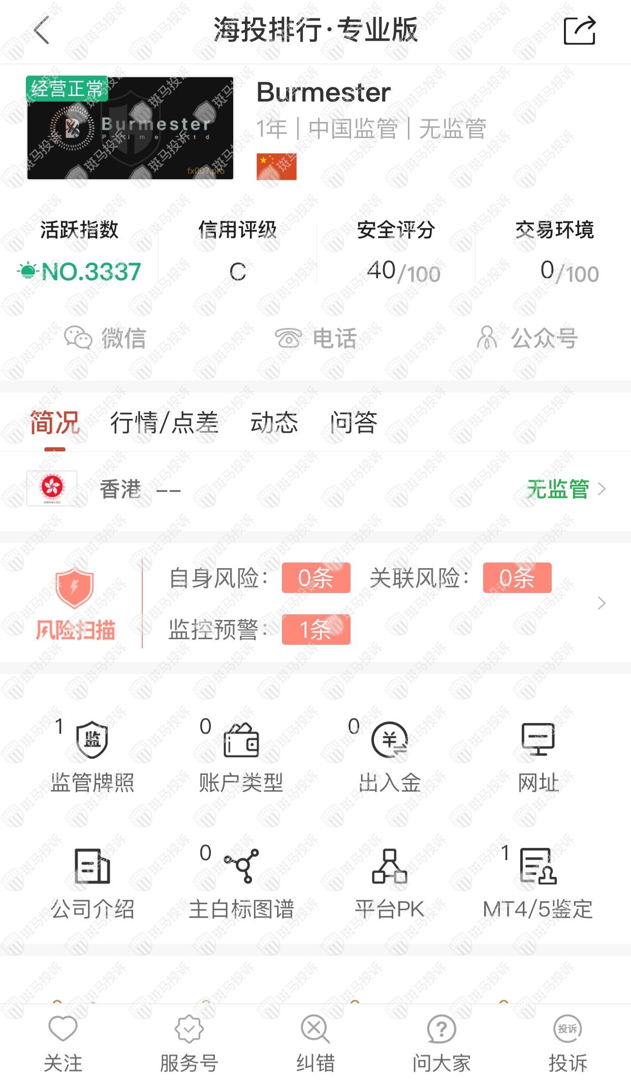 这家平台叫Burmester,成立于2021年,全球排名3337名,目前无监管,没有外汇牌照,不能做外汇保证金交易,风险扫描显示1条风险,投资者资金安全无保障。