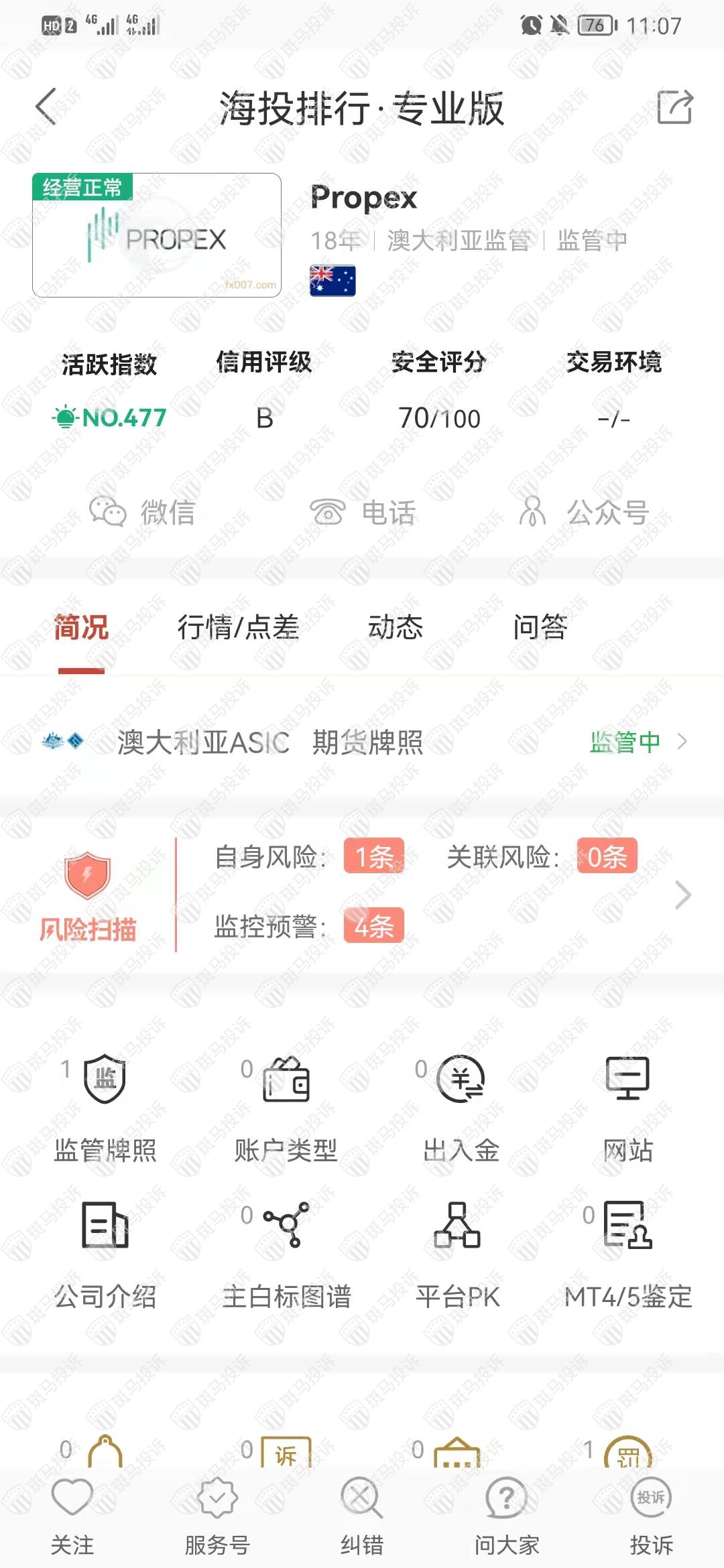 这家平台叫Propex,成立于2005年,全球活跃指数477名,目前有一个澳大利亚ASIC监管,但是没有外汇牌照,不能做外汇保证金交易,风险扫描显示5条风险,投资者资金安全无保障。