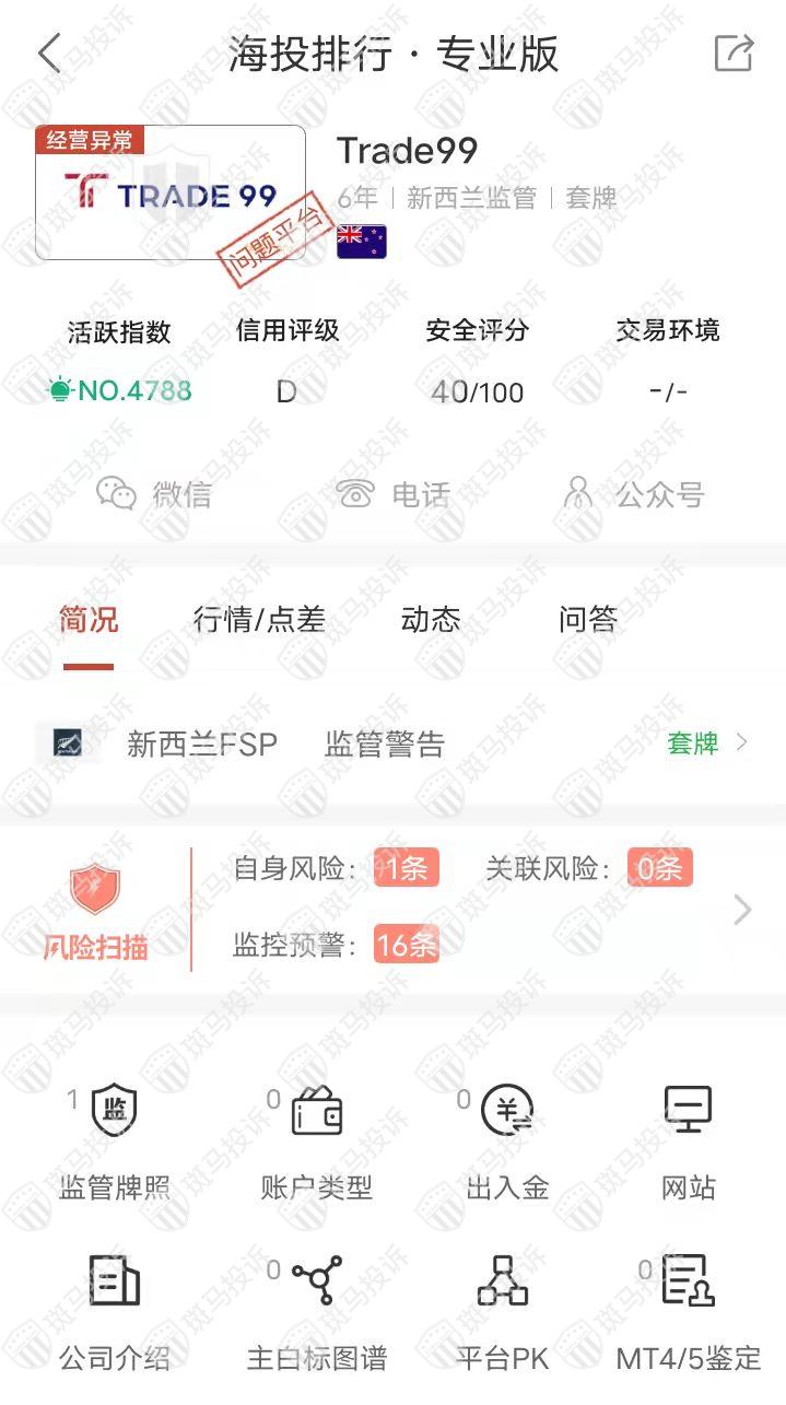 这家平台叫Trade99,成立于2017年,全球活跃指数4788名,目前无监管,但是存在套牌行为,没有外汇牌照,不能做外汇保证金交易,风险扫描显示17条风险,投资者资金安全无保障。