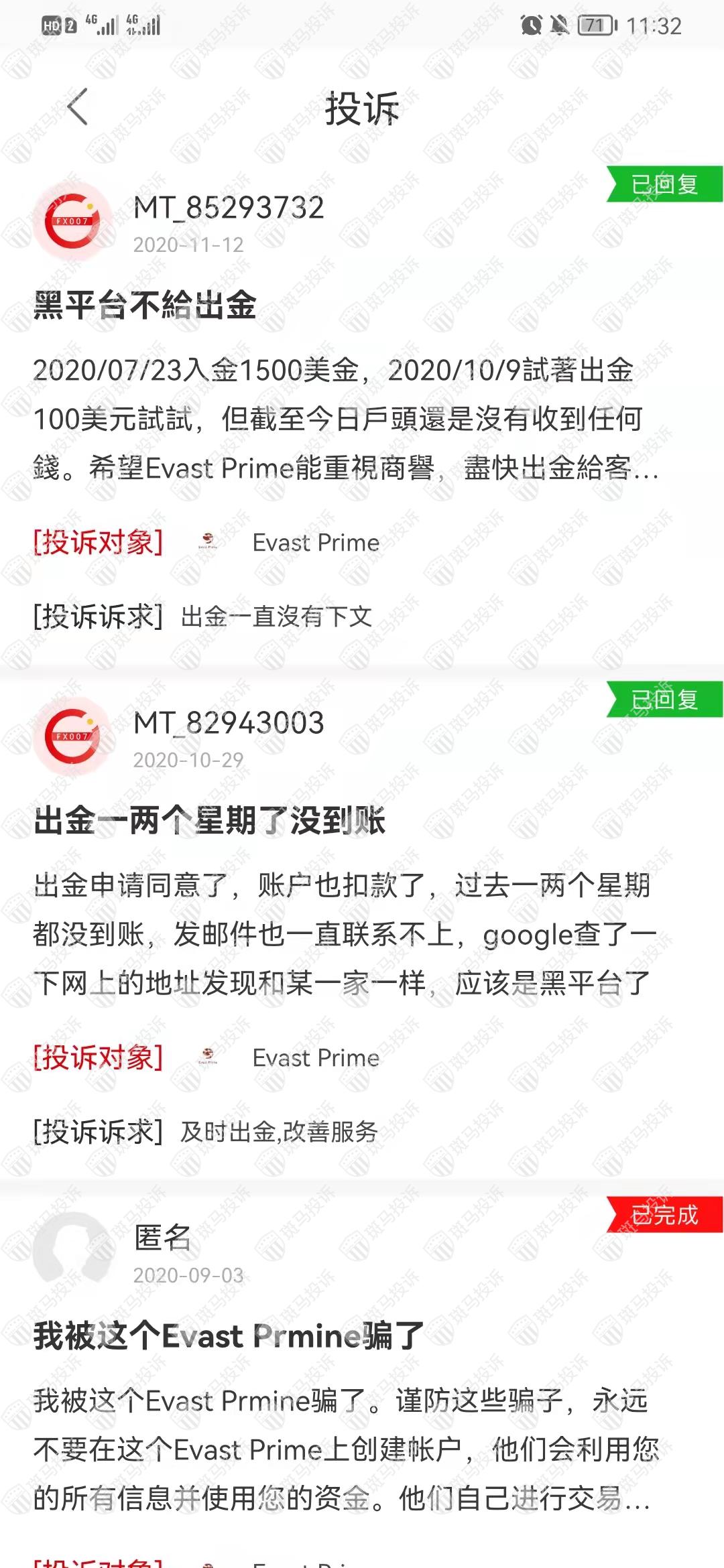Evast Prime平台现在在斑马投诉有3条投诉,其中2条已回复,1条已完成。