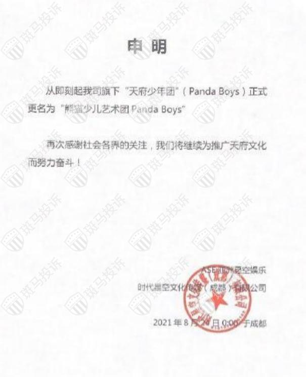 在舆论压力下,今天凌晨,天府少年团官微发布公告,组合正式改名为“熊猫少儿艺术团Panda Boys”,还特意强调“不做饭圈文化,没有资本运作”。