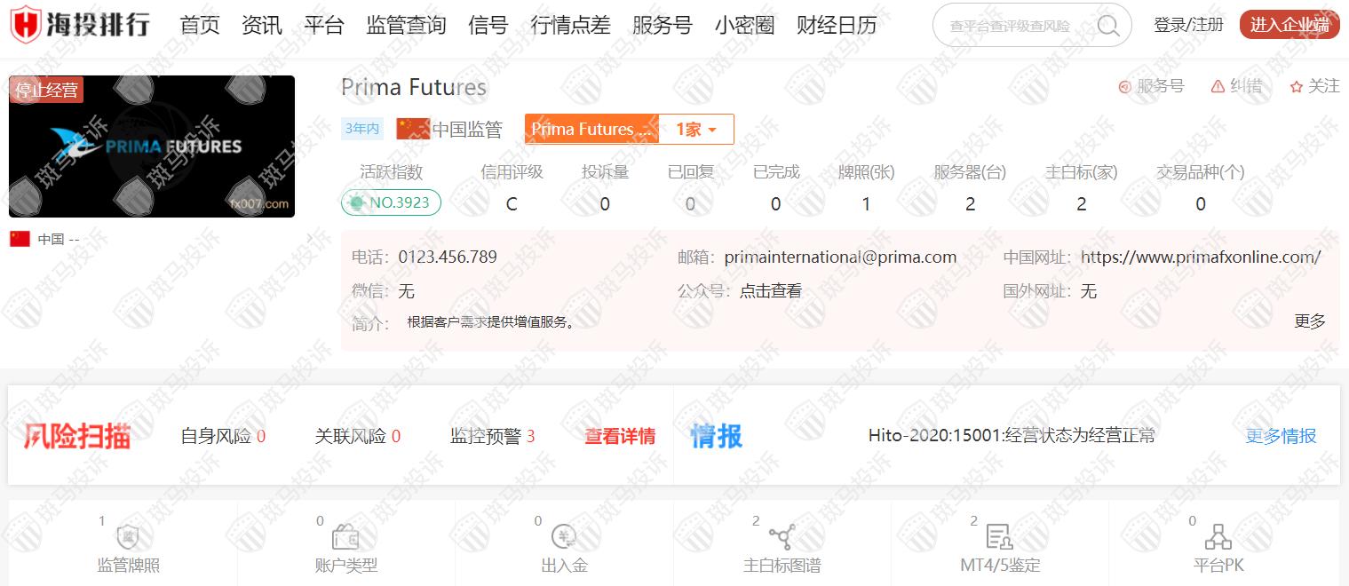 这家平台叫Prima Futures,成立于2019年,全球排名3923名,目前停止经营,无监管,没有外汇牌照,不能做外汇保证金交易,风险扫描显示3条风险,投资者资金安全无保障。
