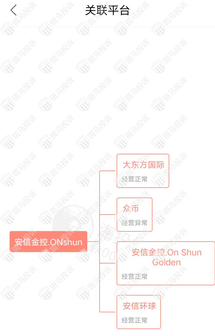 主白标关系显示,ONshun安信金控平台目前和4家平台存在关联,其中一家存在经营异常。