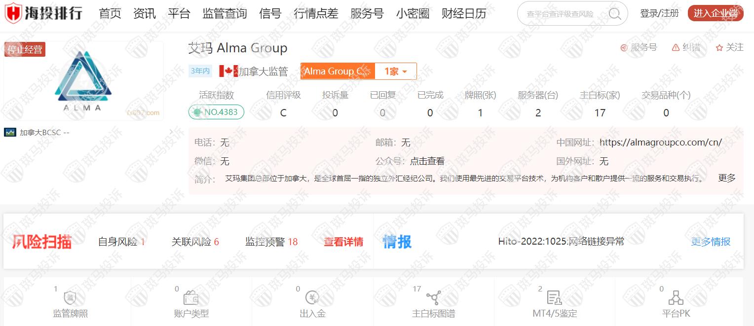 这家平台叫Alma Group艾玛,成立于2019年,全球排名4383名,目前停止经营,无监管,没有外汇牌照,不能做外汇保证金交易,风险扫描显示18条风险,投资者资金安全无保障。