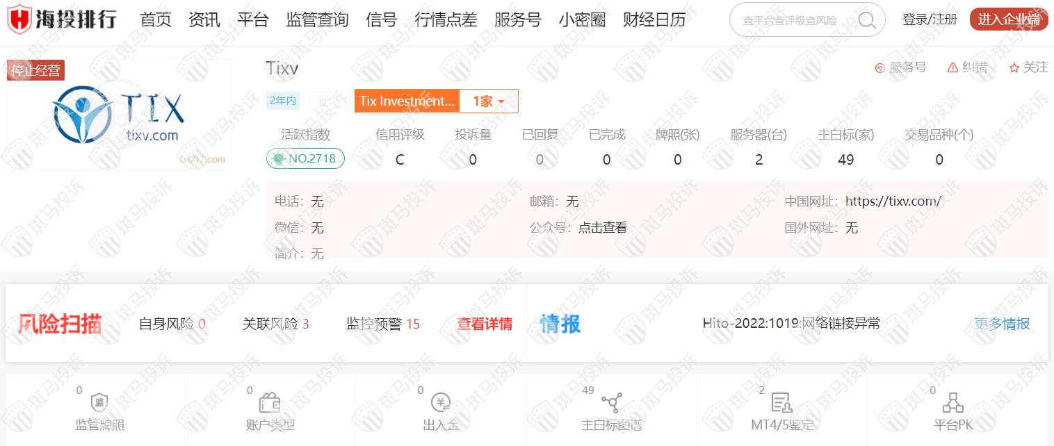 这家平台叫Tixv,成立于2020年,全球排名2718名,目前停止经营,无监管,没有外汇牌照,不能做外汇保证金交易,风险扫描显示15条风险,投资者资金安全无保障。