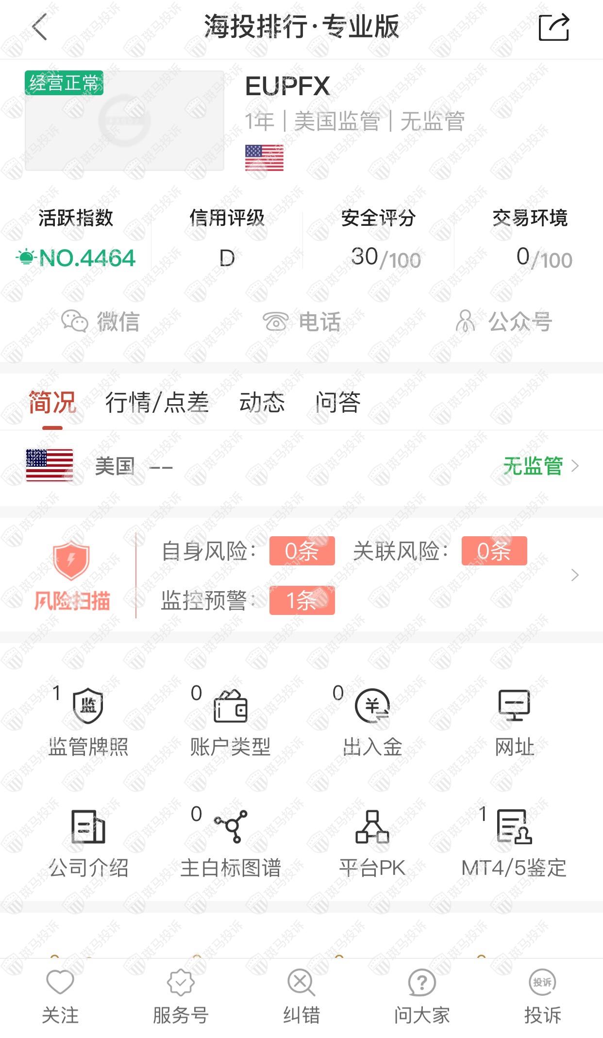 这家平台叫EUPFX,成立于2021年,全球排名4461名,目前无监管,没有外汇牌照,不能做外汇保证金交易,风险扫描显示1条风险,投资者资金安全无保障。