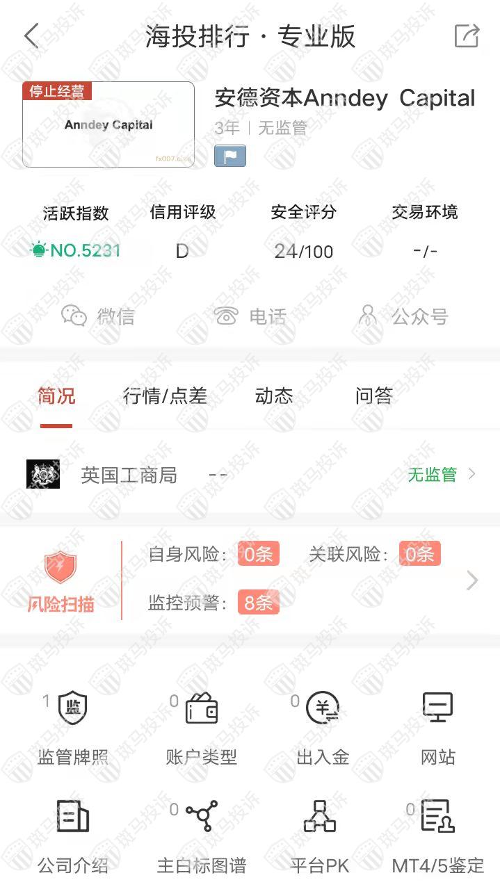 据海投排行资料显示,Anndey Capital安德资本平台成立于2019年,全球活跃指数5231名,目前无监管,没有外汇牌照,不能做外汇保证金交易,风险扫描显示8条风险,投资者资金安全无保障。