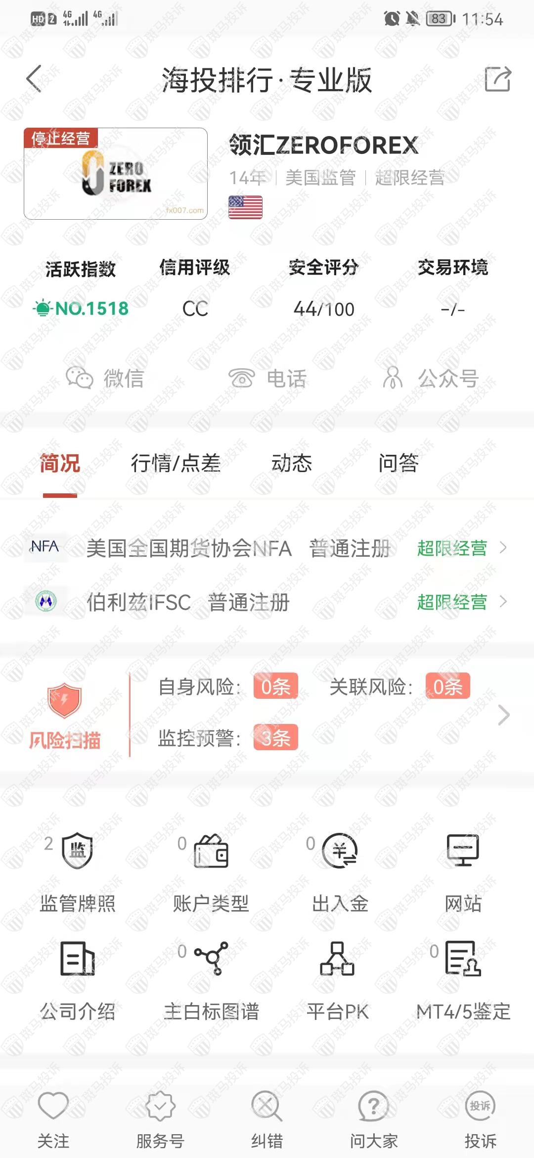 这家平台叫领汇ZEROFOREX,成立于2009年,全球活跃指数1518名,目前有美国全国期货协会NFA和伯利兹IFSC监管,但是没有外汇牌照,不能做外汇保证金交易,风险扫描显示3条风险,投资者资金安全无保障。