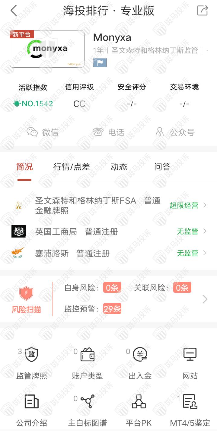 这家平台叫Monyxa,成立于2020年,全球排名1542名,目前有1个圣文森特和格林纳丁斯FSA的监管,还在英国工商局和塞浦路斯普通注册,但是没有外汇牌照,不能做外汇保证金交易,风险扫描显示29条风险,投资者资金安全无保障。