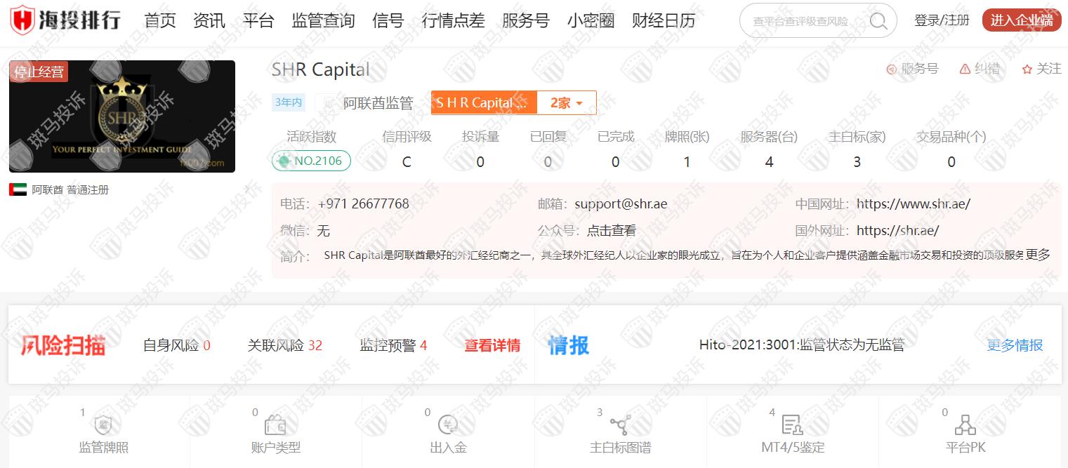 这家平台叫SHR Capital,成立于2020年,全球排名2106名,目前停止经营,无监管,没有外汇牌照,不能做外汇保证金交易,风险扫描显示4条风险,投资者资金安全无保障。