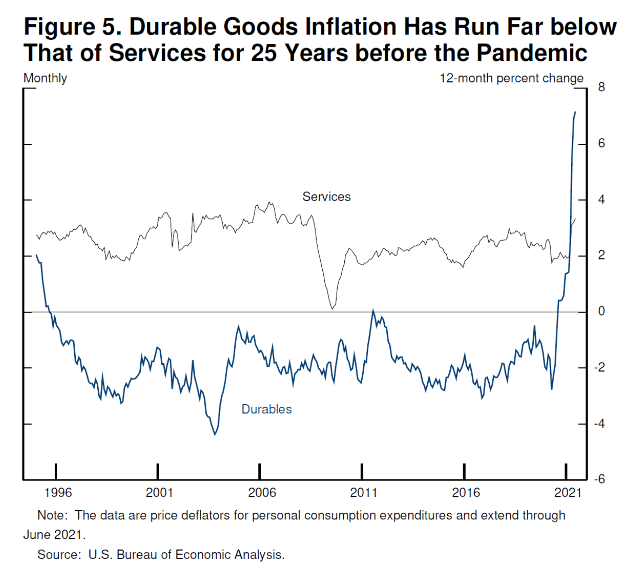 图5:耐用品通胀在疫情前的25年间一直低于服务业通胀