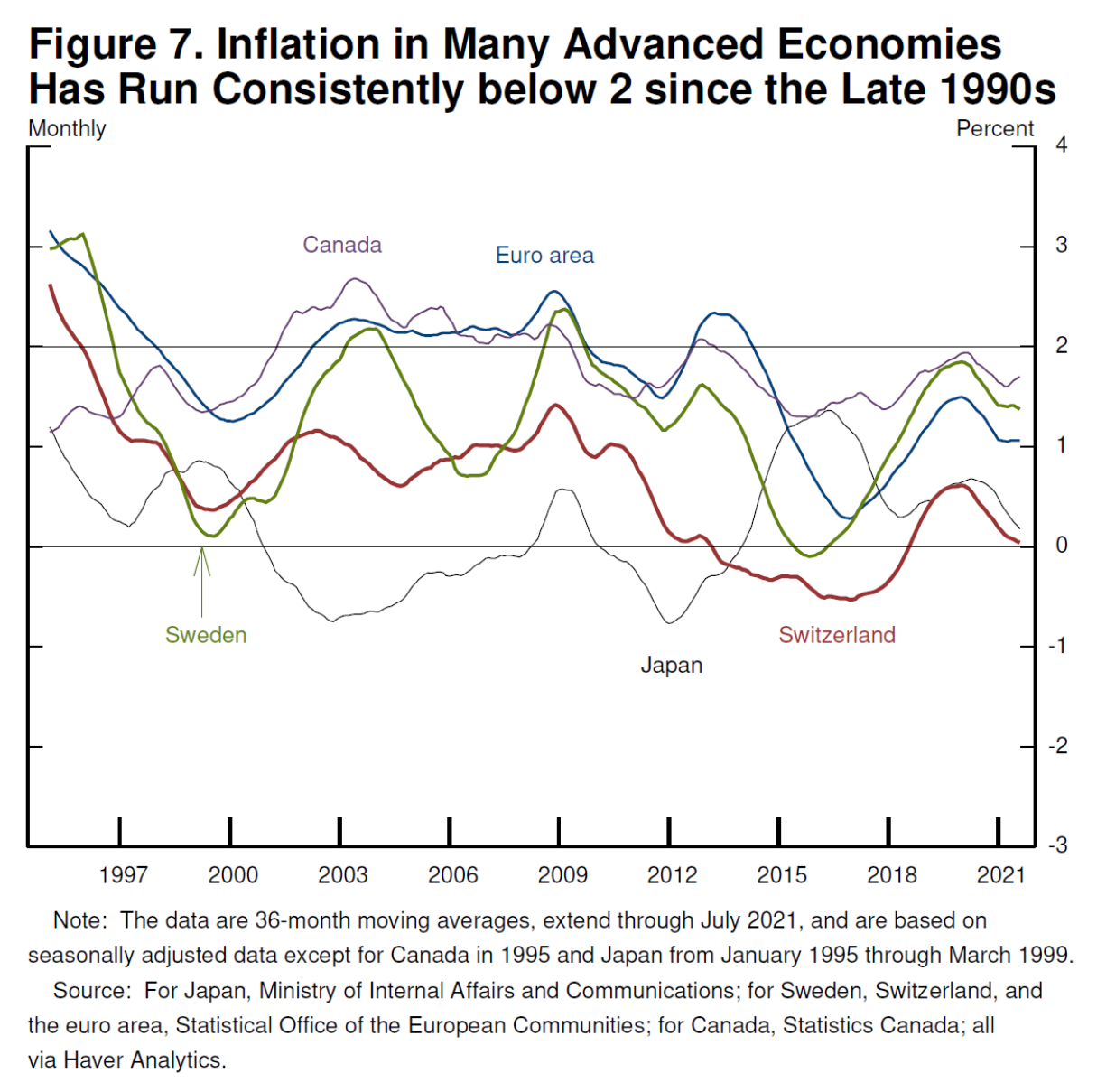 图7:上世纪90年代以来,发达经济体通胀长期不达2%