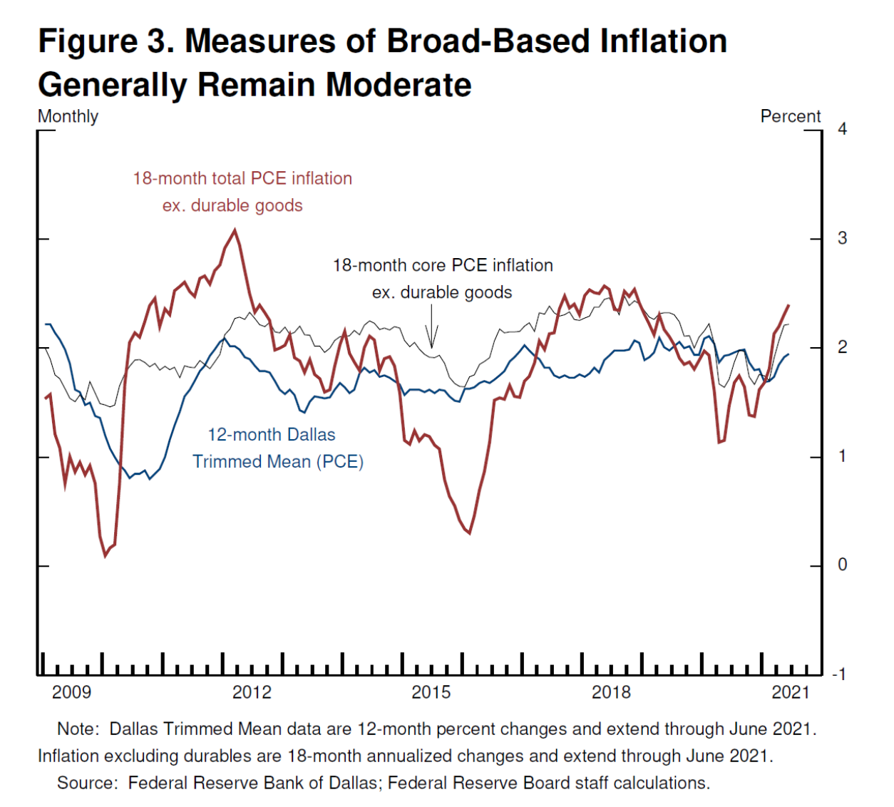 通货膨胀的飙升主要是受到疫情和经济重新开放直接影响的几类相对狭窄的商品和服务。仅仅是耐用品就对最近12个月的总体/核心通胀率贡献了大约1%。能源价格伴随强劲的复苏而反弹,为总体通胀率又平添了0.8%,根据长期经验,我们预计这些涨幅的通胀影响是临时性的。此外,一些价格——例如,酒店房间和飞机票的价格在经济衰退期间急剧下降,现在已经回升到接近疫情前的水平。我们在计算通货膨胀时使用的12个月窗口期现在恰好捕捉到了价格的反弹,但没有捕捉到最初的下降,临时地提高了报告的通货膨胀水平。这些影响使测量的通货膨胀率增加了几成,其影响应该会随着时间的推移而消失。