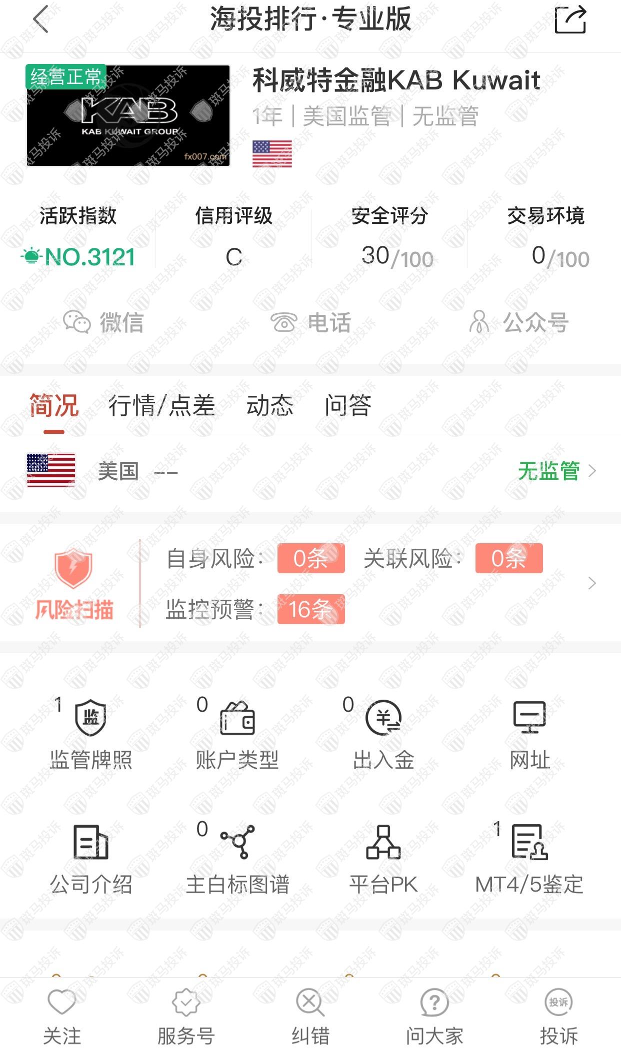 这家平台叫科威特金融KAB Kuwait,成立于2020年,全球排名3121名,目前无监管,没有外汇牌照,不能做外汇保证金交易,风险扫描显示16条风险,投资者资金安全无保障。