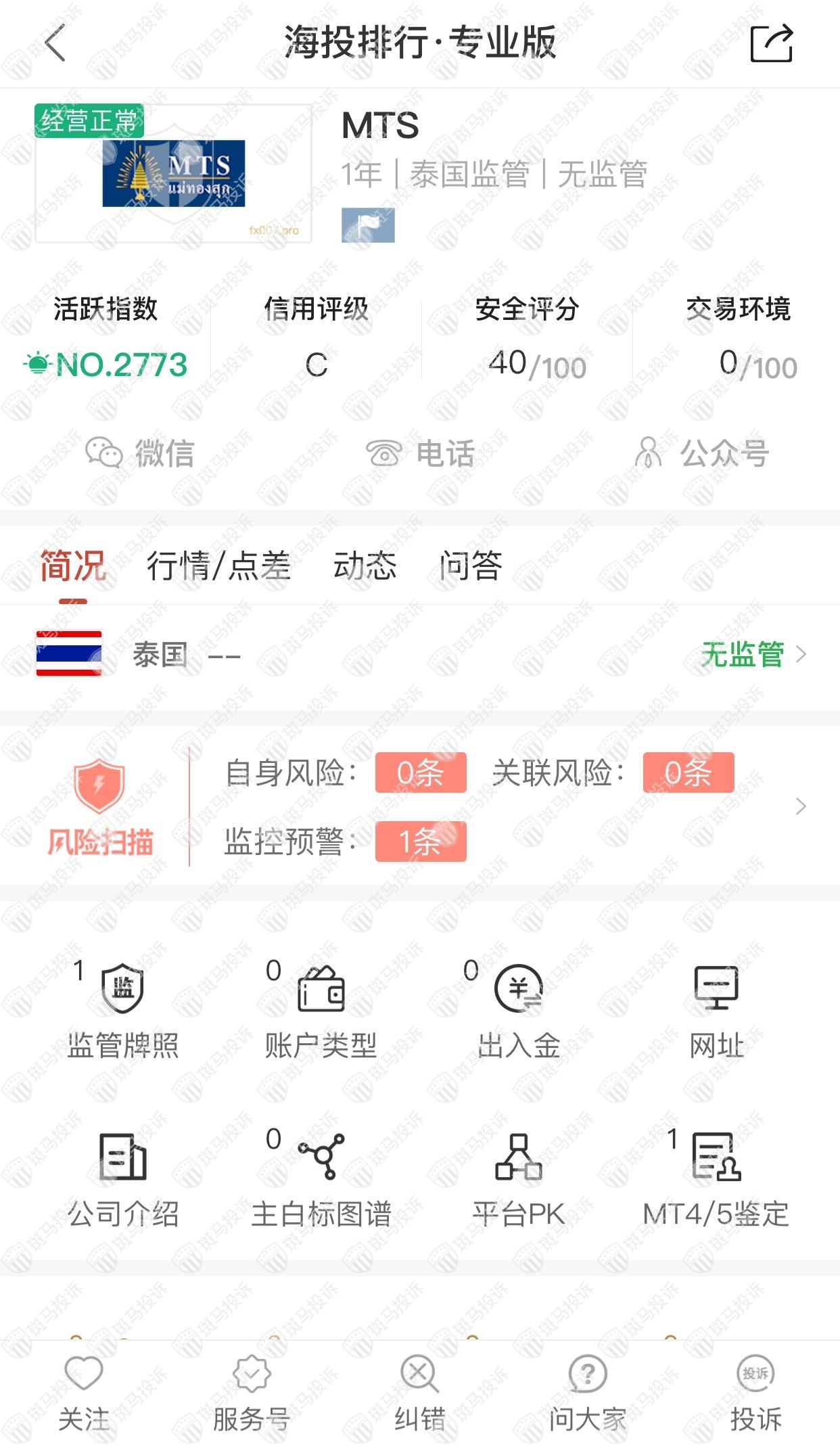 这家平台叫MTS,成立于2021年,全球排名2772名,目前无监管,没有外汇牌照,不能做外汇保证金交易,风险扫描显示1条风险,投资者资金安全无保障。