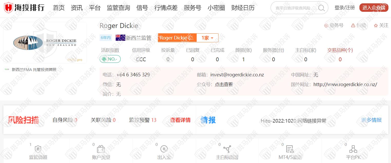 Roger Dickie平台受新西兰FMA监管,监管号码FSP512246,风险扫描显示13条风险,投资者需注意其风险提示信息。
