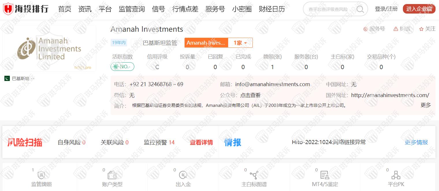 Amanah Investments平台风险扫描显示14条风险,投资者需注意其风险提示信息。
