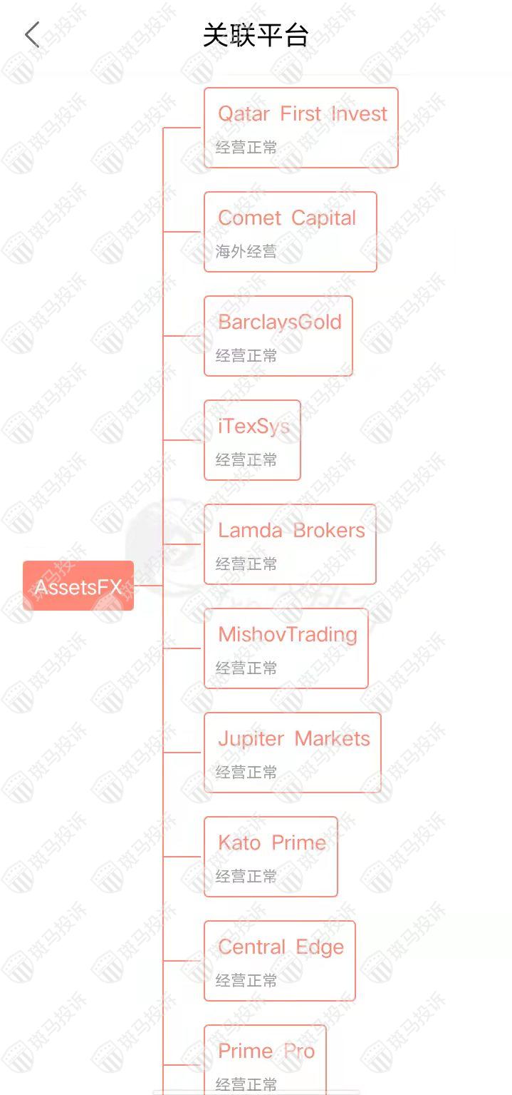 主白标关系显示,AssetsFX平台和19家平台存在关联,其中1家存在经营异常情况。