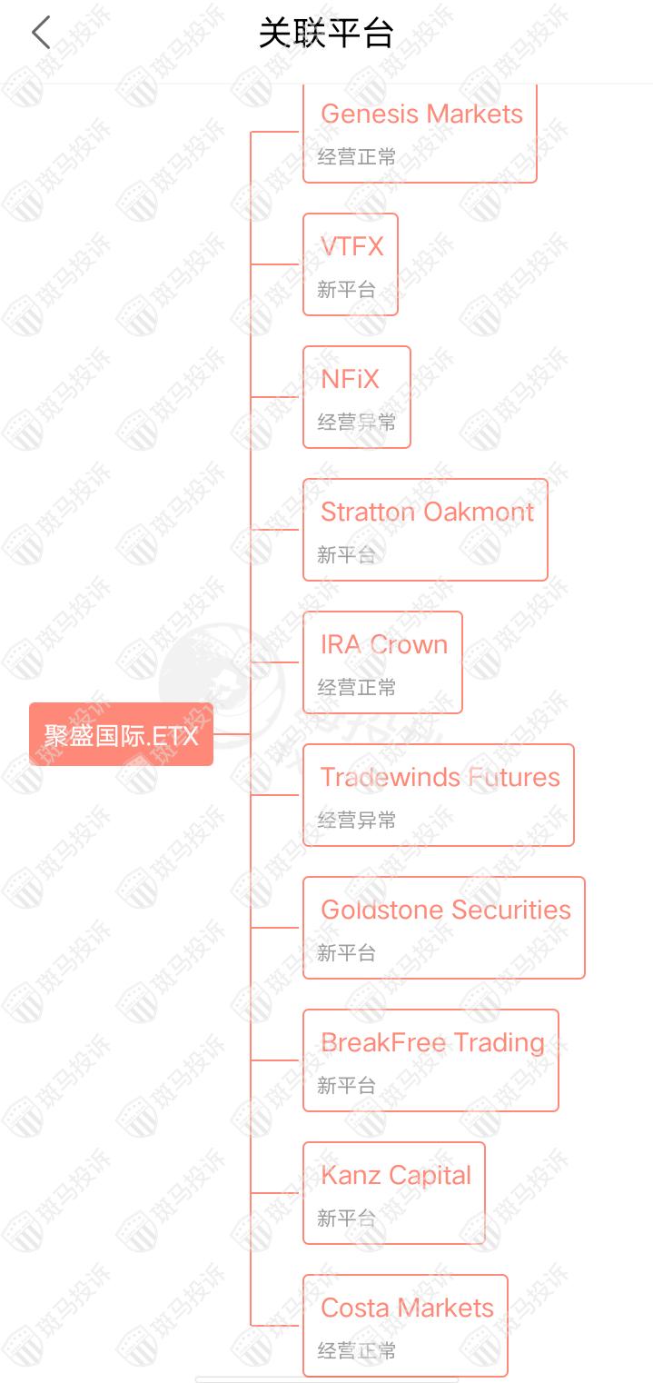 主白标关系显示,ETX聚盛国际平台和10家平台存在关联,其中有两家存在经营异常情况。