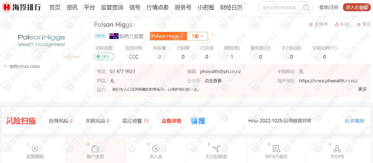 Polson Higgs平台从2015年开始受新西兰FMA监管,监管号码FSP26381,风险扫描显示13条风险,投资者需注意其风险提示信息。