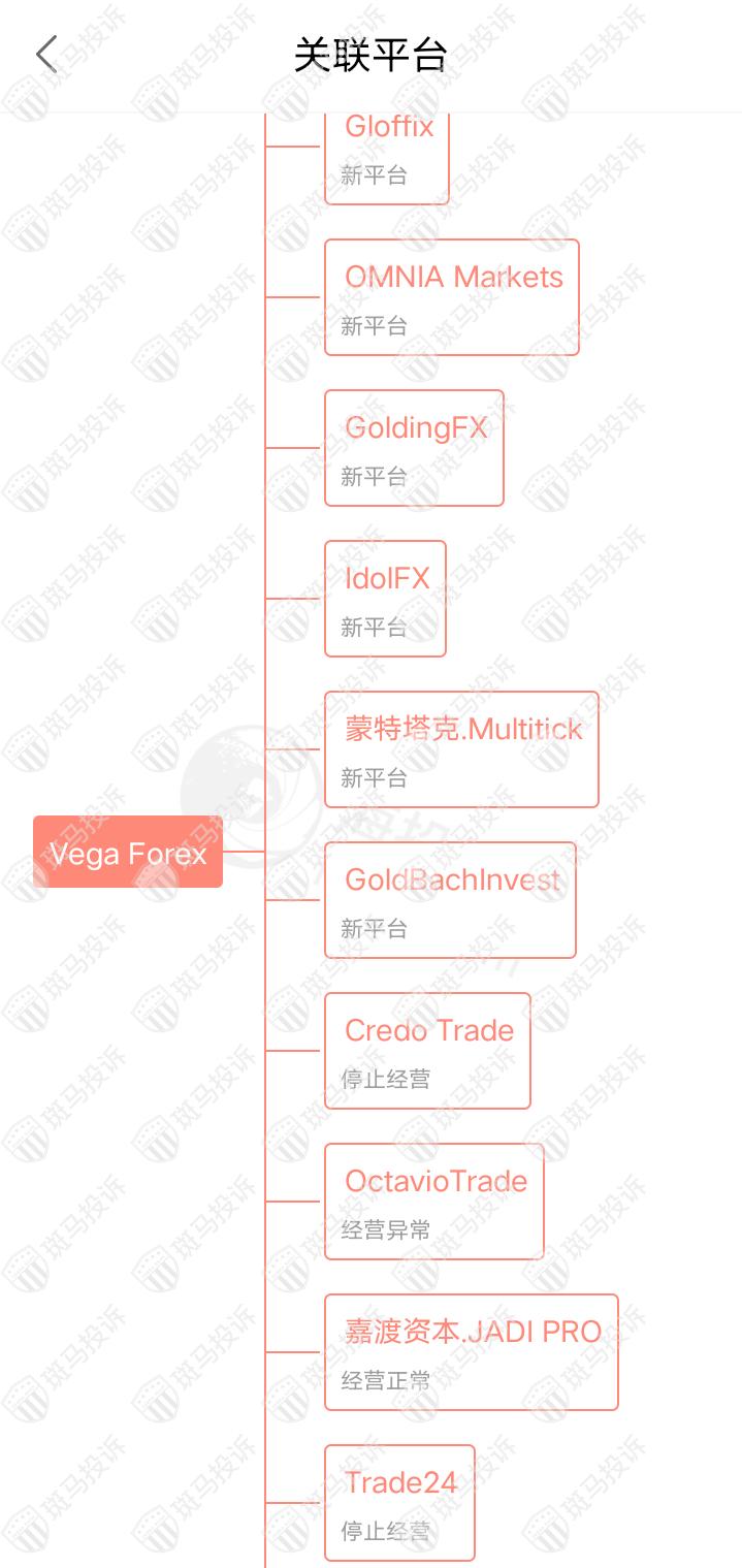 主白标关系显示,Vega Forex平台目前和76家平台存在关联,其中关联的多家平台存在经营异常、出金延迟和停止经营等情况。Vega Forex和停止经营的Trade24平台是一家公司,从他们的服务器地址,网站的模板来看,都可以看出来相似的地方。