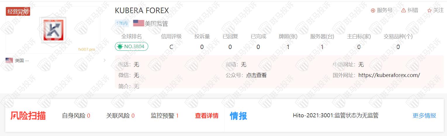 KUBERA FOREX在斑马投诉暂无收到相关投诉信息,目前该平台处于经营异常状态。