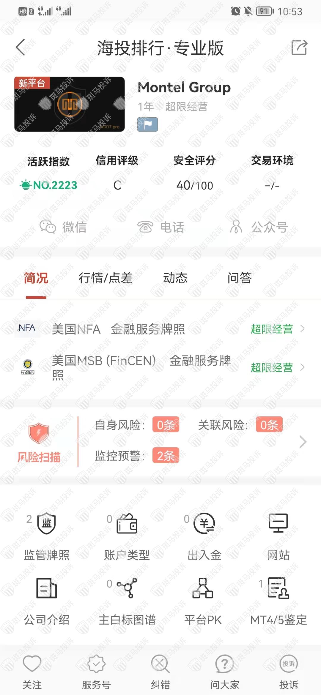这家平台叫Montel Group,成立于2022年,全球活跃指数2223名,目前有美国NFA和1美国MSB (FinCEN)个监管,但是没有外汇牌照,不能做外汇保证金交易,风险扫描显示2条风险,投资者资金安全无保障。