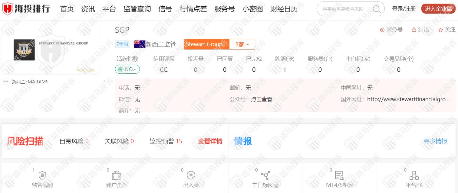 SGP从2015年开始受新西兰FMA监管,监管号码FSP441406,风险扫描显示15条风险,投资者需注意其风险提示信息。