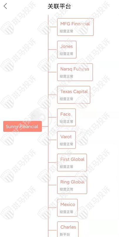 主白标关系显示,Sunny Financial平台和13家平台相关联,目前这些平台都经营正常。