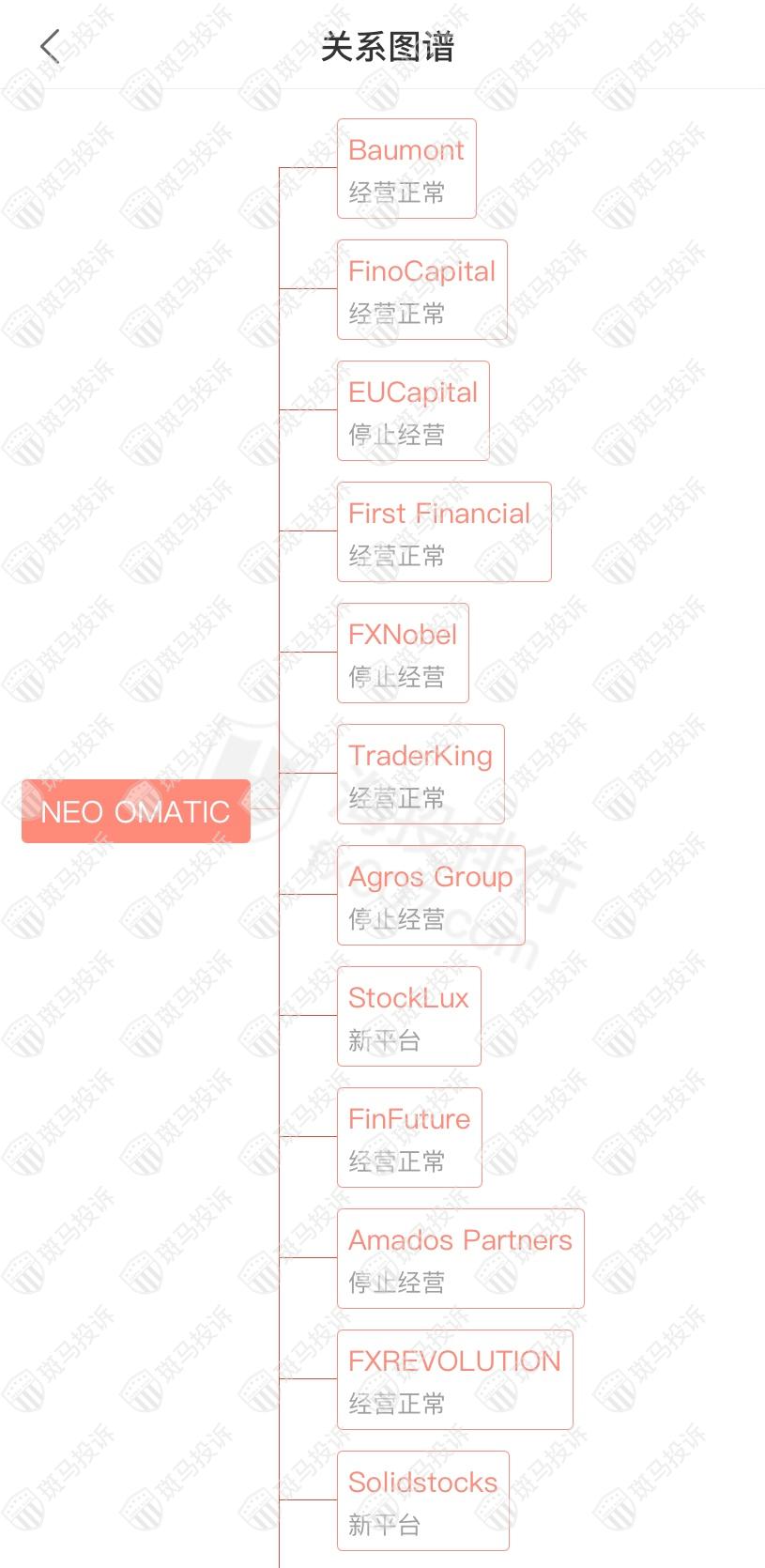 主白标关系显示NEO OMATIC平台和52家平台是一家公司,从他们的服务器地址,网站的模板来看,都可以看出来相似的地方。其中Primo Trade出金延迟;Mercuryo经营异常;EUCapital、FXNobel、Agros Group、Amados Partners停止经营。