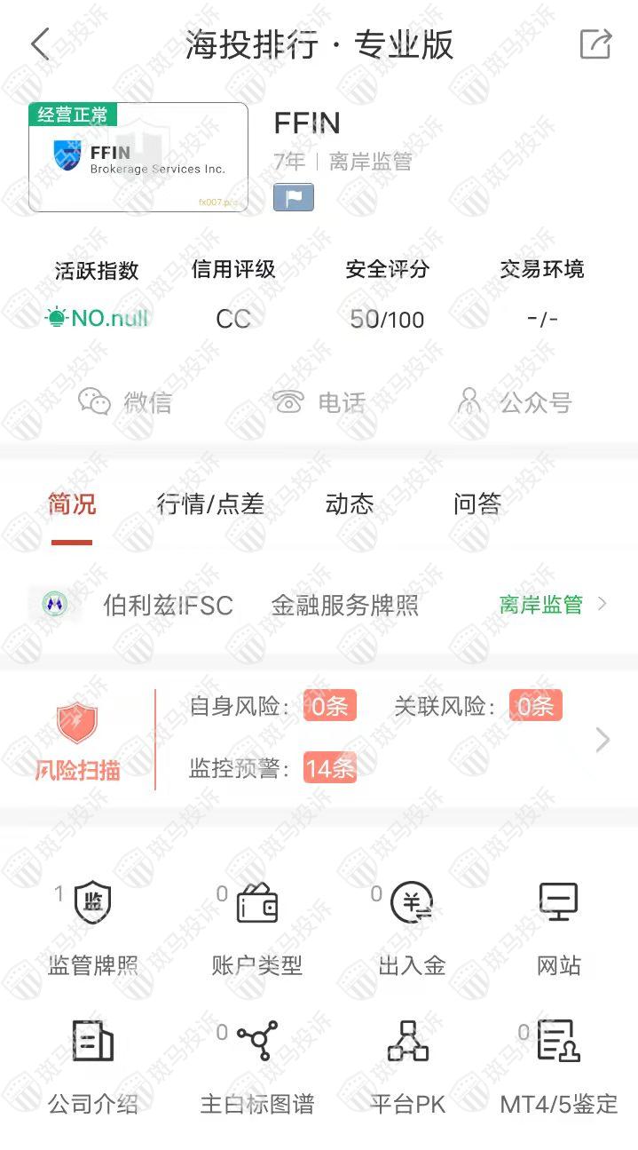 这家平台叫FFIN,成立于2015年,无全球活跃指数,目前有1个伯利兹IFSC的监管,但是没有外汇牌照,不能做外汇保证金交易,风险扫描显示14条风险,投资者资金安全无保障。