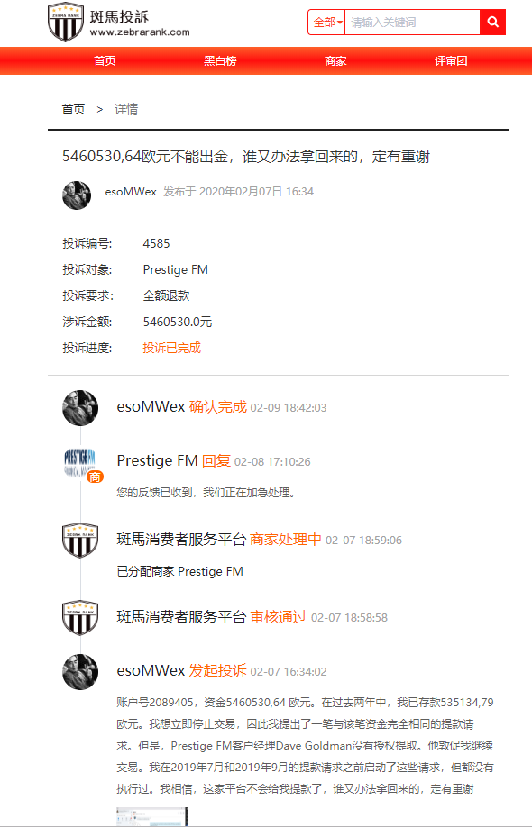 据投诉者反馈,账户号2089405,资金5460530,64 欧元。在过去两年中,我已存款535134,79欧元。我想立即停止交易,因此我提出了一笔与该笔资金完全相同的提款请求。但是,Prestige FM客户经理Dave Goldman没有授权提取。他敦促我继续交易。我在2019年7月和2019年9月的提款请求之前启动了这些请求,但都没有执行过。我相信,这家平台不会给我提款了,谁又办法拿回来的,定有重谢。